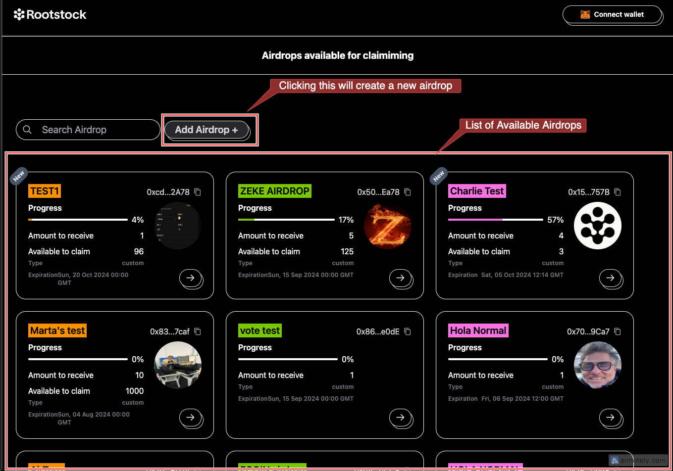 - The first airdrop on the list is called “Test”. Here's a breakdown of what you’ll see on the airdrop card: